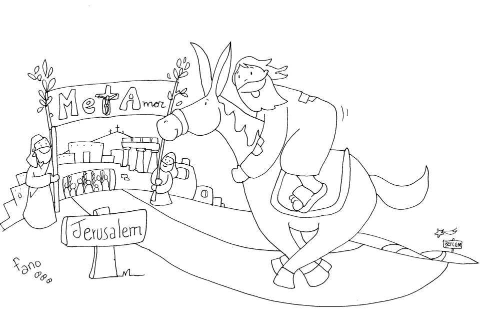 Ho fa cavalcant amb un pollí, un ase petit, tal com diu l’Evangeli, no un cavall de carreres. I ho fa tot mogut per l’amor. Per això el cartell de l’arribada, de la meta, acaba amb la paraula “Amor”.