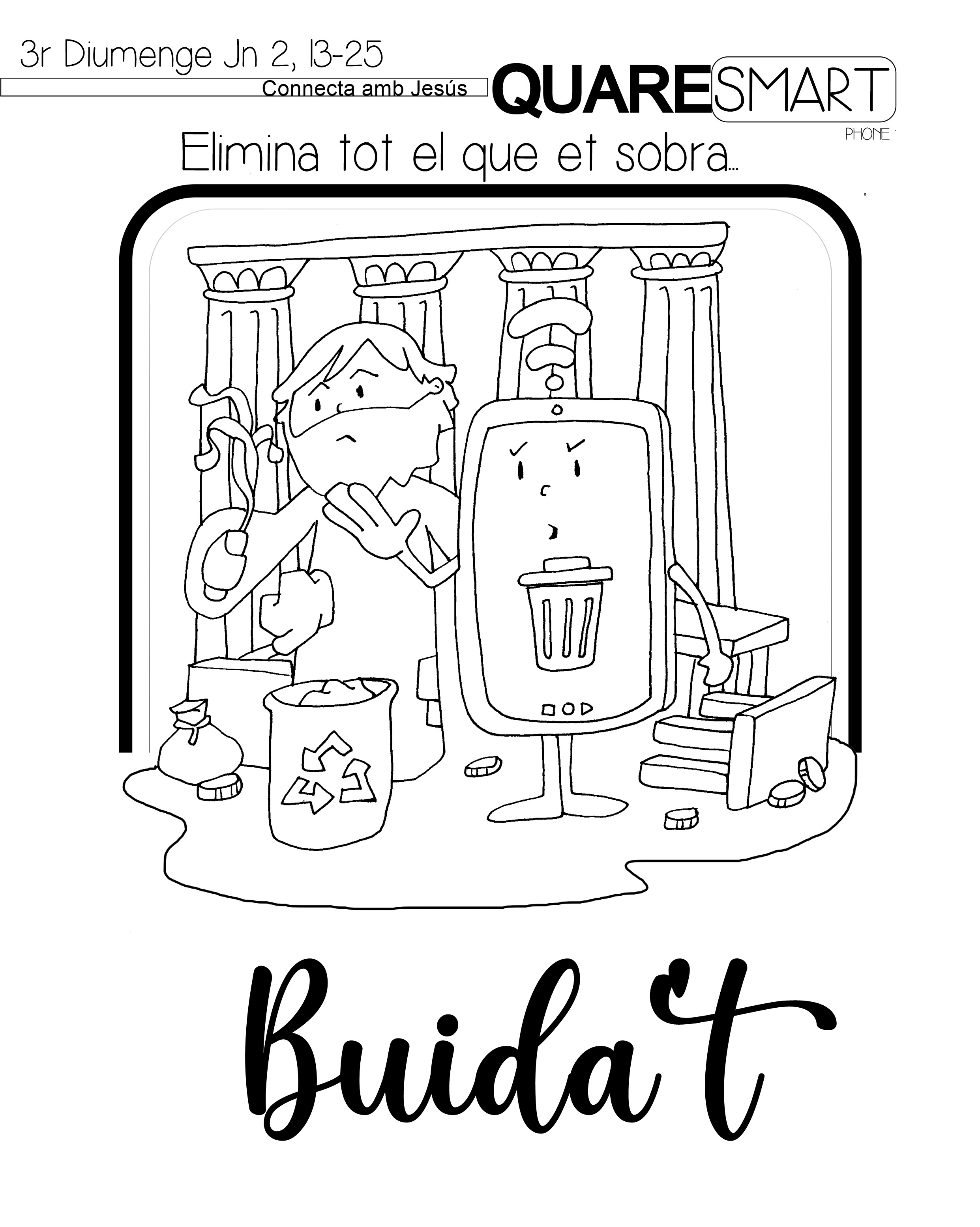 Hi ha dos elements centrals en el dibuix: la figura de Jesús i el dibuix del signe d’escombraries, de neteja, de fer desaparèixer, que en el món digital (del nostre mòbil) es representa així: un cubell d’escombraries.