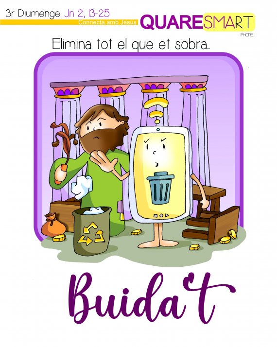Recordo dels meus temps, quan era catequista de 5è de Primària que explicant aquest fragment de l’Evangeli (que per cert l’expliquen els 4 evangelistes), un nen veient la diapositiva d’un Jesús enfadat amb el fuet de cordes a la mà, va dir que Jesús tenia mal geni, i que feia un gest violent, sobretot quan feia moure els animals destinats al sacrifici, sense miraments, de forma contundent i decidida, traient-los d’aquell espai que era diferent: era un Temple, no un mercat. La meva resposta és que no és el mateix tenir "geni“ que “mal geni”, i sobretot segons les circumstàncies… Hi ha diferències, oi?